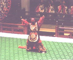 舞楽では龍笛の退吹(おめりぶき)による林邑乱声(らんじょう)が奏される中、面をつけ裲襠(りょうとう)装束をまとい、右手には桴(ばち)を持った舞人が登台して出手を舞います。ついで抜頭音取に続き当曲が舞われます。