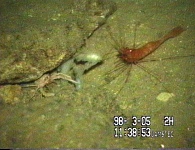 | ↑ソコボウズ | ↑左、隠れ蓑を背負ったカニの一種、ホモラ科の仲間 | ↑海底に半身を埋めたツバサシロウリガイと巻貝 | |||